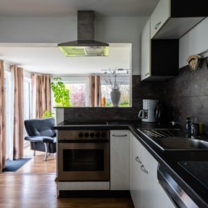 Unsere Ferienwohnung Christa ist im Erdgeschoss, ist allerdings innerhalb der Wohnung in verschiedenen Ebenen angelegt. 2 x 2 Stufen innerhalb der Wohnung. Die Küche ist offen gestaltet mit Essecke, Boden ist mit Laminat belegt.