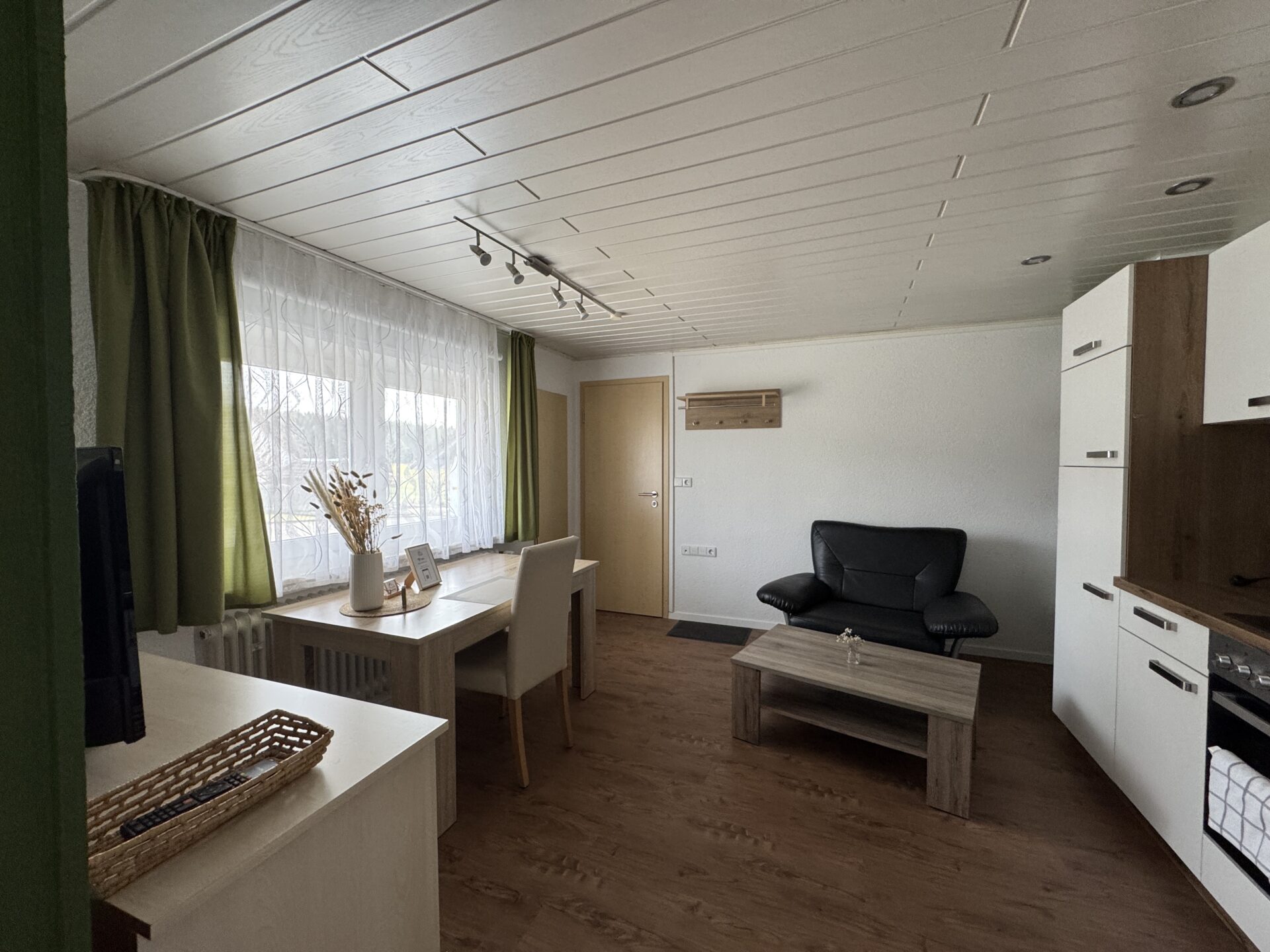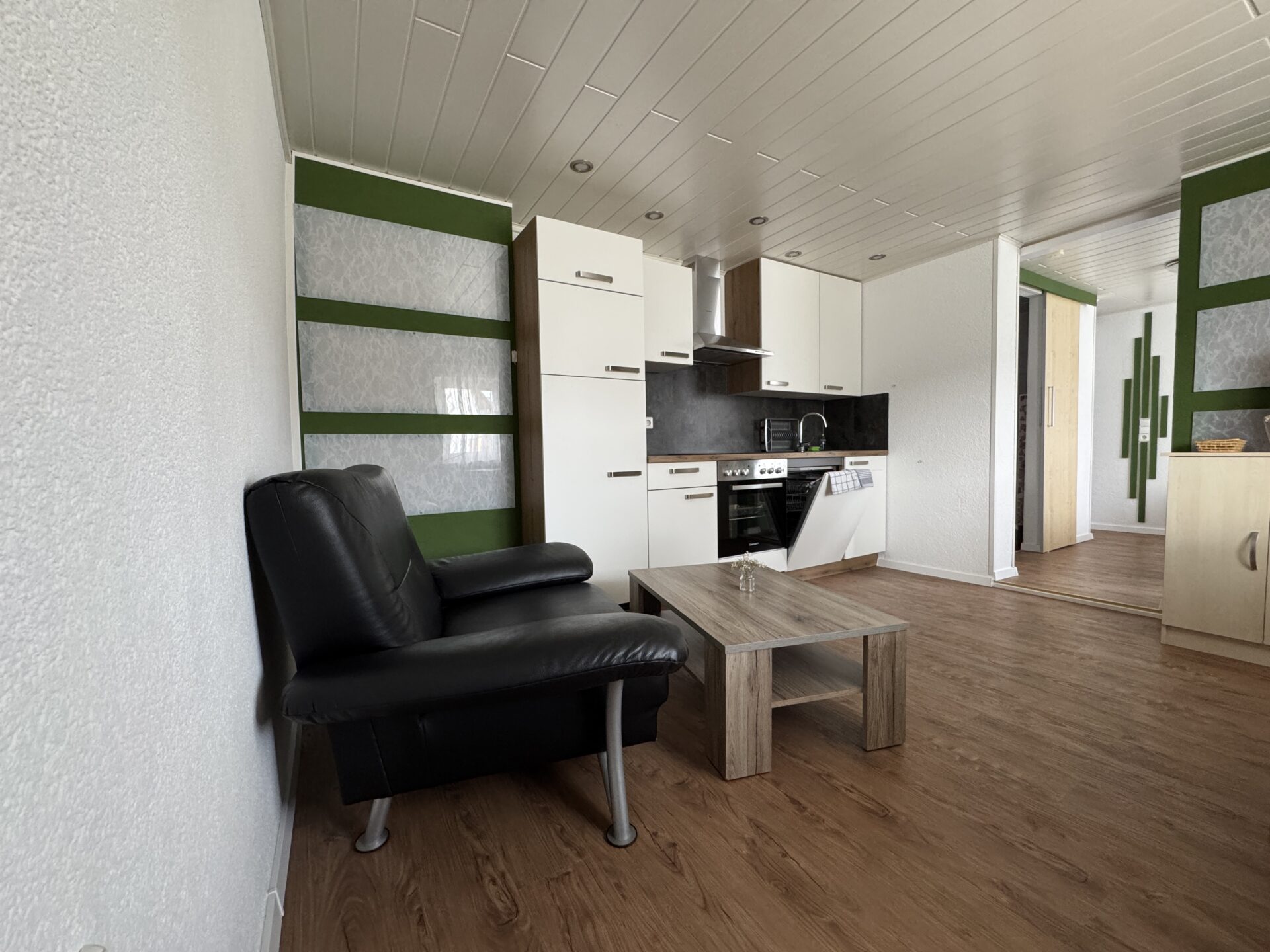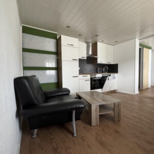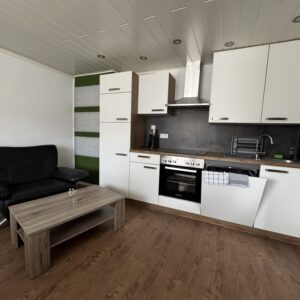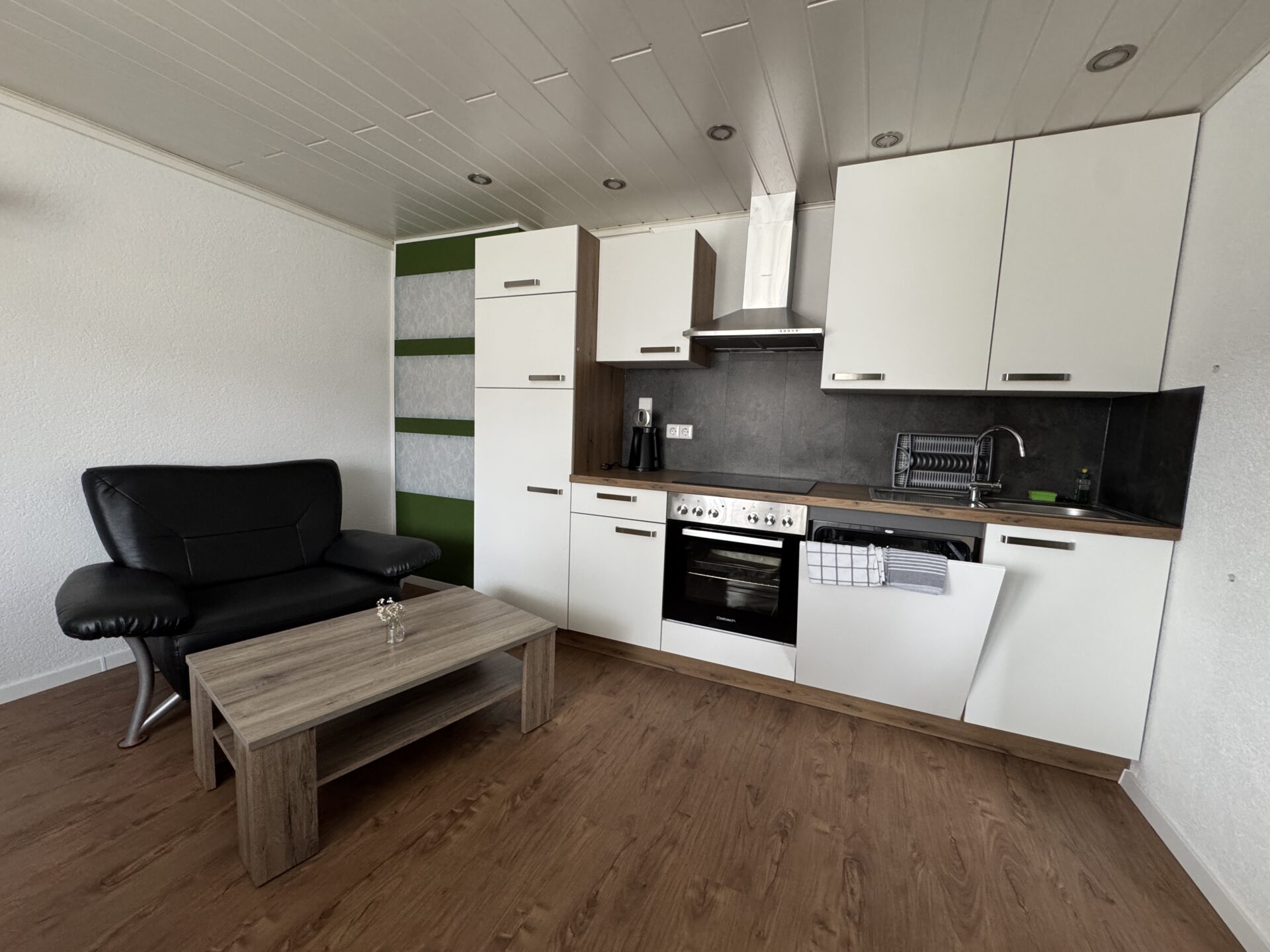 Die Küche ist als praktische Küchenzeile ausgeführt und eignet sich ideal für die Zubereitung kleiner Mahlzeiten. Der durchgehend verlegte Laminatboden sorgt für eine helle, gepflegte Atmosphäre.