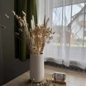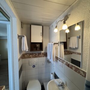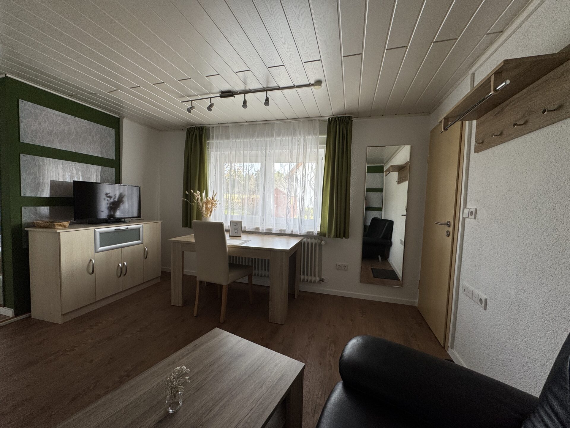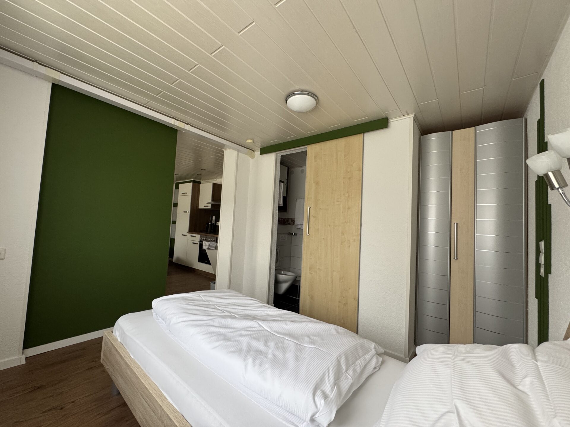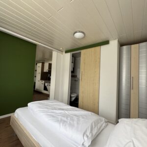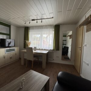 Die 35 m² große Ferienwohnung Monika liegt im Erdgeschoss und bietet ein behagliches Zuhause für bis zu zwei Personen. Zwei separate Räume, die durch einen schmalen Durchgang miteinander verbunden sind, schaffen eine angenehme Raumaufteilung mit klar getrennten Wohn- und Schlafbereichen.